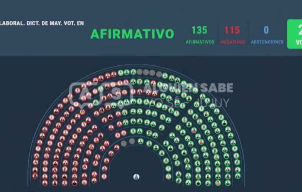 La votación terminó con 135 votos positivos frente a 115 negativos, consolidando una mayoría que acompañó la reforma impulsada bajo el argumento de flexibilizar reglas, reducir litigiosidad y generar condiciones reales para contratar trabajadores sin miedo a la industria del juicio.