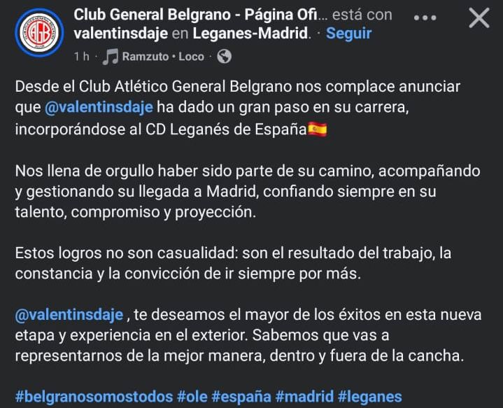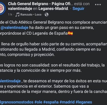 El club General Belgrano ha expresado un inmenso orgullo por el logro de Daje, destacando el acompañamiento y la gestión para concretar su arribo a Madrid. "Nos llena de orgullo haber sido parte de su camino, acompañando y gestionando su llegada a Madrid, confiando siempre en su talento, compromiso y proyección", publicaron desde la institución, subrayando que este éxito es el resultado del trabajo, la constancia y la inquebrantable convicción del jugador por siempre ir por más. El club le deseó el mayor de los éxitos, confiando en que representará a Jujuy "de la mejor manera, dentro y fuera de la cancha".