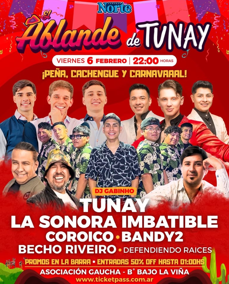 El evento “Ablande de Tunay” ya tiene su line up confirmado y promete una noche de fiesta el próximo 6 de febrero en la Asociación Gaucha . La banda Tunay , anfitriona del encuentro, será una de las protagonistas de la jornada.